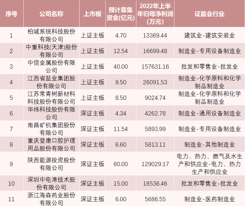 沪市方面,有江苏常青树新材料科技股份有限公司(常青科技)、江西省盐业集团股份有限公司(江盐集团)、中信金属股份有限公司(中信金属)、中重科技(天津)股份有限公司(中重科技)、柏诚系统科技股份有限公司(柏诚股份)5家。上述公司的拟融资金额分别为8.50亿元、9.50亿元、40亿元、12.54亿元、4.70亿元,合计募资75.24亿元。