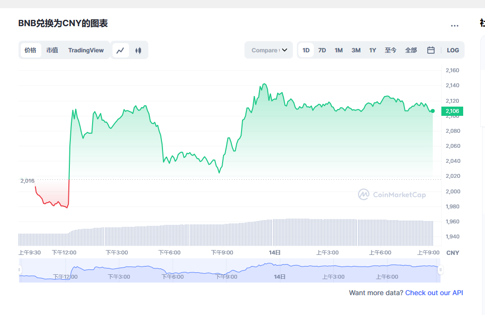 导读今日币安币行情如何,1BNB币兑换兑换多少人民币RMB?BNB 今日价格 为 ¥2,107.67 CNY,其 24 小时的交易量为 ¥7,485,185,385 CNY。 我们会实时更新BNB兑换为CNY的价格。 BNB 在过去 24 小时内增长了 5.14。 目前的 世链财经 排名为第 #4 位,其市值为 ¥332,784,391,864 CNY。 其流通供给量为 157,892,409 BNB 个货币 目前无法提供供给量上限信息。