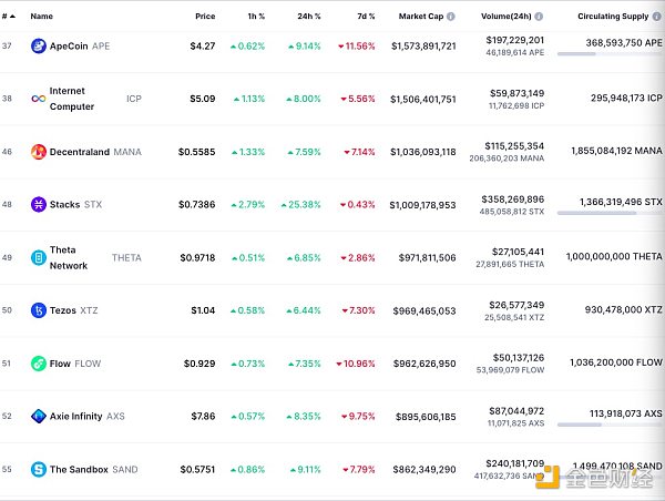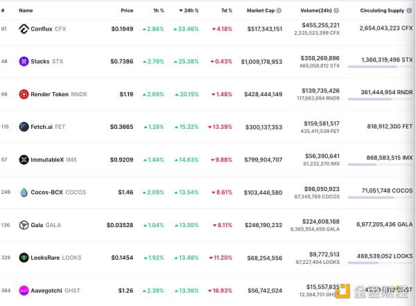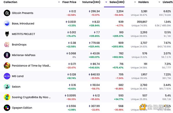 24小时NFT交易量、交易量前十项目 数据来源:Coinmarketcap