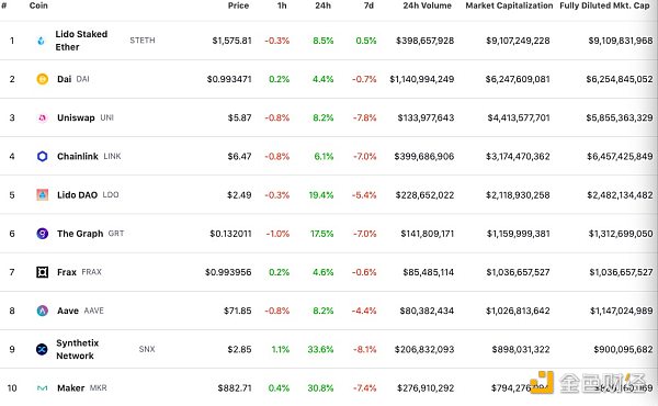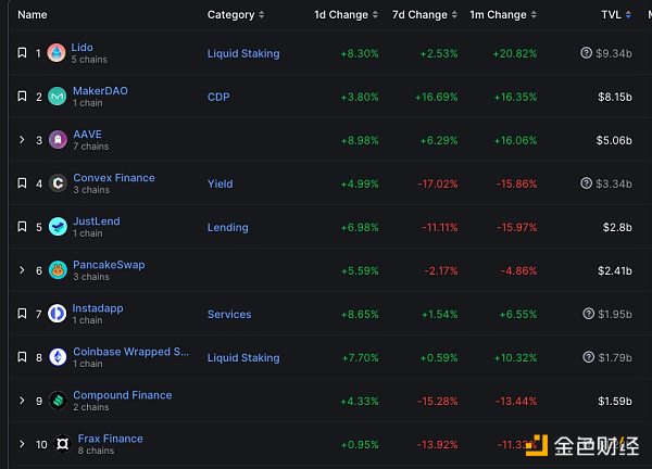 DeFi项目锁定资产前十排名及锁仓量 数据来源:defillama