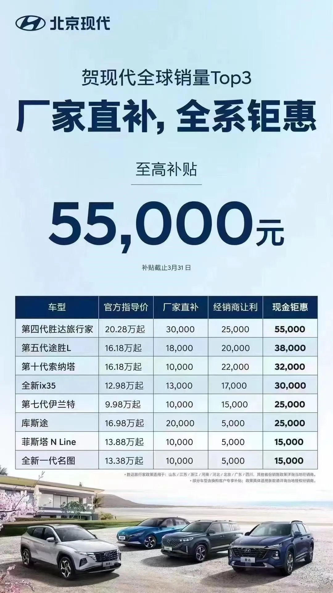 同日,北京现代发布综合优惠,消费者在购买8款车型时可获得购车补贴,最高补贴5.5万元。据了解,价格优惠由厂家直补和经销商让利构成,其中,第四代胜达旅行家现金优惠可达5.5万元,全新一代名图、菲斯塔N Line也有1.5万元的最低优惠。