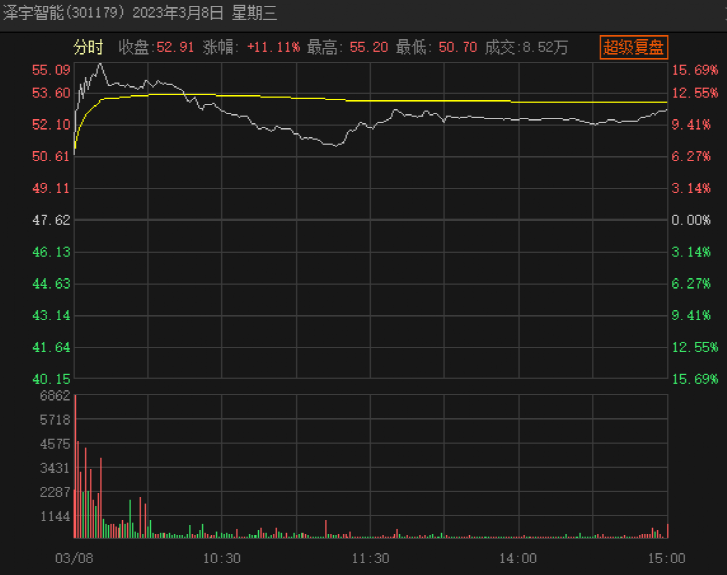 业绩和高送转方案公布次日(3月8日),泽宇智能大幅高开超6%,并伴随放量,随后一度冲高至15%,收盘涨幅也有11%。3月9日泽宇智能短暂微调一天,3月10日再整旗鼓,放量大涨10.5%。这样,公司三日涨幅接近20%。