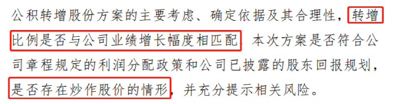 3月13日,深交所发出关注函,首先要求公司结合所处行业特点、公司发展阶段、经营模式、未来发展战略、近两年净利润、净资产、每股收益等主要财务指标的增长情况及可持续性等,详细说明制定本次利润分配及资本公积转增股份方案的主要考虑、确定依据及其合理性,转增比例是否与公司业绩增长幅度相匹配,本次方案是否符合公司章程规定的利润分配政策和公司已披露的股东回报规划,是否存在炒作股价的情形,并充分提示相关风险。