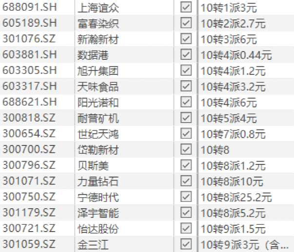 中国基金报记者根据理财笔记Choice数据进行统计,截至2023年3月13日晚,2022年度利润分配方案中包含了转增股本方式的公司达到16家,其中10转7以上的有8家。这8家公司中,目前收到关注函的有4家,除去泽宇智能和世纪天鸿,另两家是金三江和怡达股份。