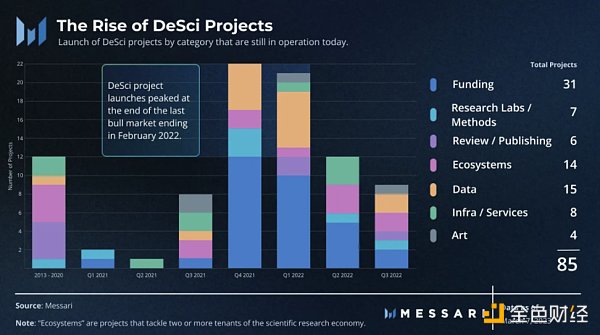 DeSci 是一个新兴的生态系统,尚未经过实战考验。大多数 DeSci 项目 (78%) 是在过去一年半开始的,从 2021 年第四季度上一轮牛市的高峰期开始。项目启动的激增恰逢 2021 年 10 月在 LisCon 期间的以太坊会议上举行的第一个 DeSci 赛道。