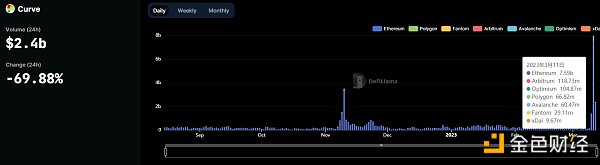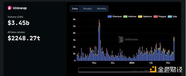 其次是Uniswap,Uniswap也是当前加密市场中交易量最大的DEX之一,USDC脱锚后的24小时内交易额飙升至34.5亿美元,创下过去四个月以来的最佳表现。截至本文撰写时,Uniswap用户支付的交易费用也升至87.5亿美元,触及过去10个月以来高点。