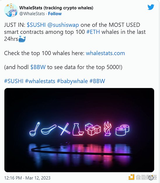 另一个受欢迎的DEX是SushiSwap,USDC危机期间该平台也见证了活跃度激增并成为以太坊巨鲸使用最多的智能合约之一。