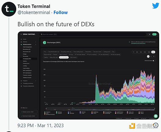 在过去3-4年里,DEX取得了突飞猛进的发展,Token Terminal披露数据显示,DEX平台的活跃开发者数量一直在稳步增长,说明支持DeFi未来的基本面向好。