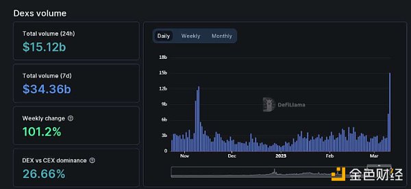 根据DeFiLlama数据显示,3月11日,DEX总交易额飙升至151.2亿美元,创下过去四个月新高,周增长率超过100%,其中Uniswap收取的费用收入也达到了自2022年5月10日以来的最高值,聚合DEX和中心化交易所 (CEX) 交易额比例(该指标反映了DEX的市场主导地位)上升至 26.66%。