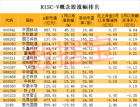 数据宝统计,截至3月13日收盘,今年以来RISC-V概念股平均涨幅19.91%,大幅跑赢同期上证指数。超半数股票年内涨幅逾20%,中国移动、东软载波、国芯科技累计涨幅排名前三位,分别达到45.32%、39.92%、36.62%。