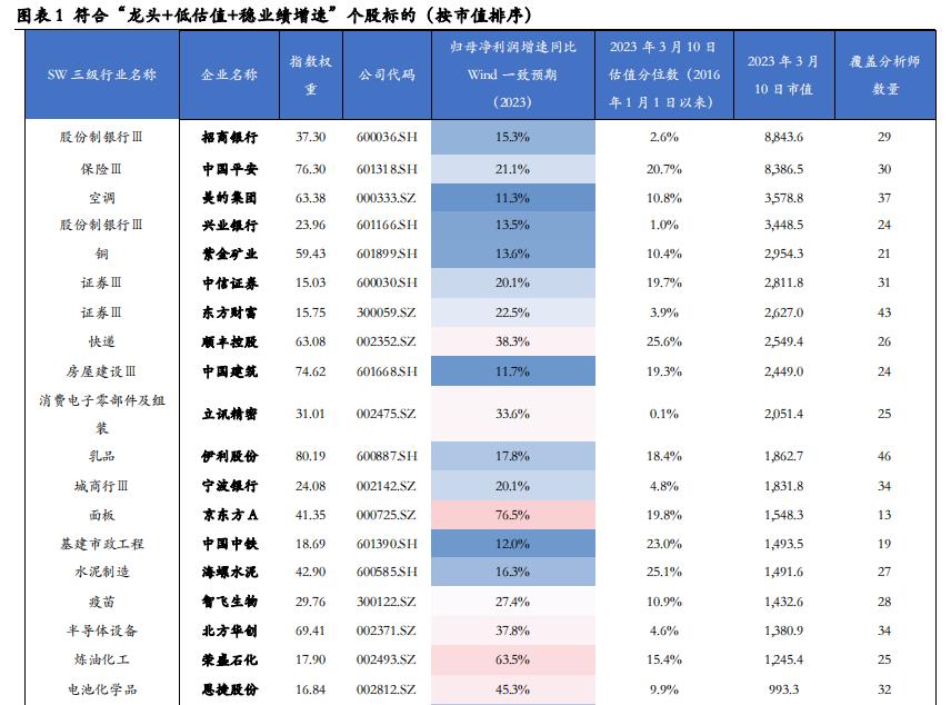 ①企业属于细分行业龙头。细分行业龙头通常具备较强的稳定性。对此,以SW三级行业为基础,筛选标准为SW三级行业指数排名靠前的权重股。SW三级行业成分股数量小于10支的行业,选择最大的权重股;对于成分股数量超过10支(含)的行业,选择排名第一、第二的权重股。为了避免某些子细分行业龙头股过小的影响,还剔除了部分市值小于100 亿(2023年3月10日收盘价计算)的标的。