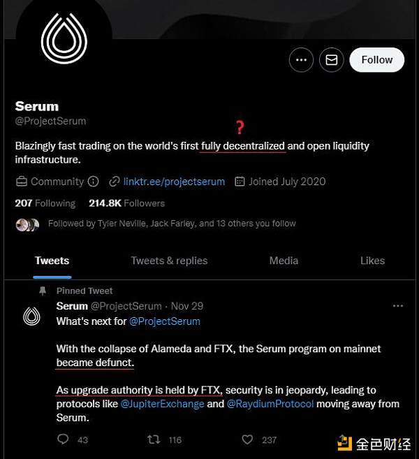 而且许多这样的系统拥有远比他们表面上表现出来的更加中心化的控制。例如,正如 Jameson Lopp 本月早些时候指出的那样,在 Solana 区块链上称为 Serum 的 DeFi 协议在其 Twitter 简介和其他地方将自己推销为完全去中心化的,然而在其简介下面有一条关于它如何由于中心化控制而失败的置顶推文。