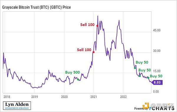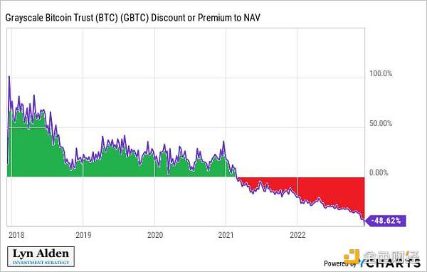 在整个 2021 年和 2022 年,该行业开始遇到周期问题。早期的问题始于灰度比特币信托(GBTC)的资产净值溢价(premium over nav)转向资产净值折扣(discount- below nav)。换句话说,曾有一段时间,该基金的市场价格是基金中每一美元比特币的 1.40 美元,而现在,该基金中每一美元比特币的市场价格低于 60 美分。