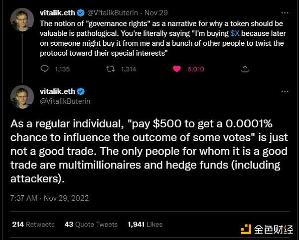 以太坊的联合创始人 Vitalik Buterin 最近提出了与治理 Token 相关的经济问题,我同意他的观点: