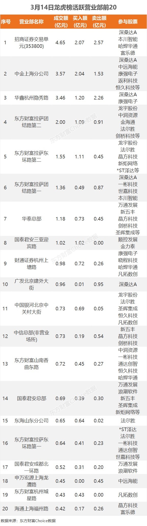 从活跃营业部来看,招商证券交易单元(353800)日内成交额4.65亿元,参与了深桑达A、本川智能、哈焊华通和富乐德。中金上海分公司日内成交额3.57亿元,参与了深桑达A、中远海能、康强电子、返利科技、恒久科技等。华泰总部日内成交额1.18亿元,参与了万通发展、新五丰、晶方科技、剑桥科技、圣晖集成等。