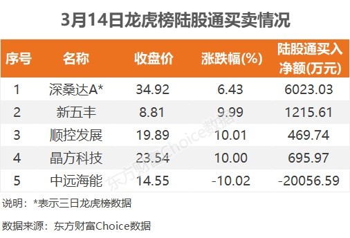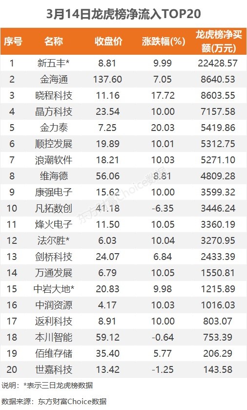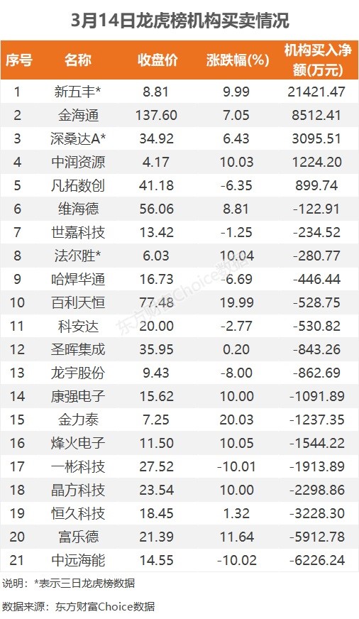 3月14日龙虎榜揭秘:2.24亿抢筹新五丰 机构净买5只股