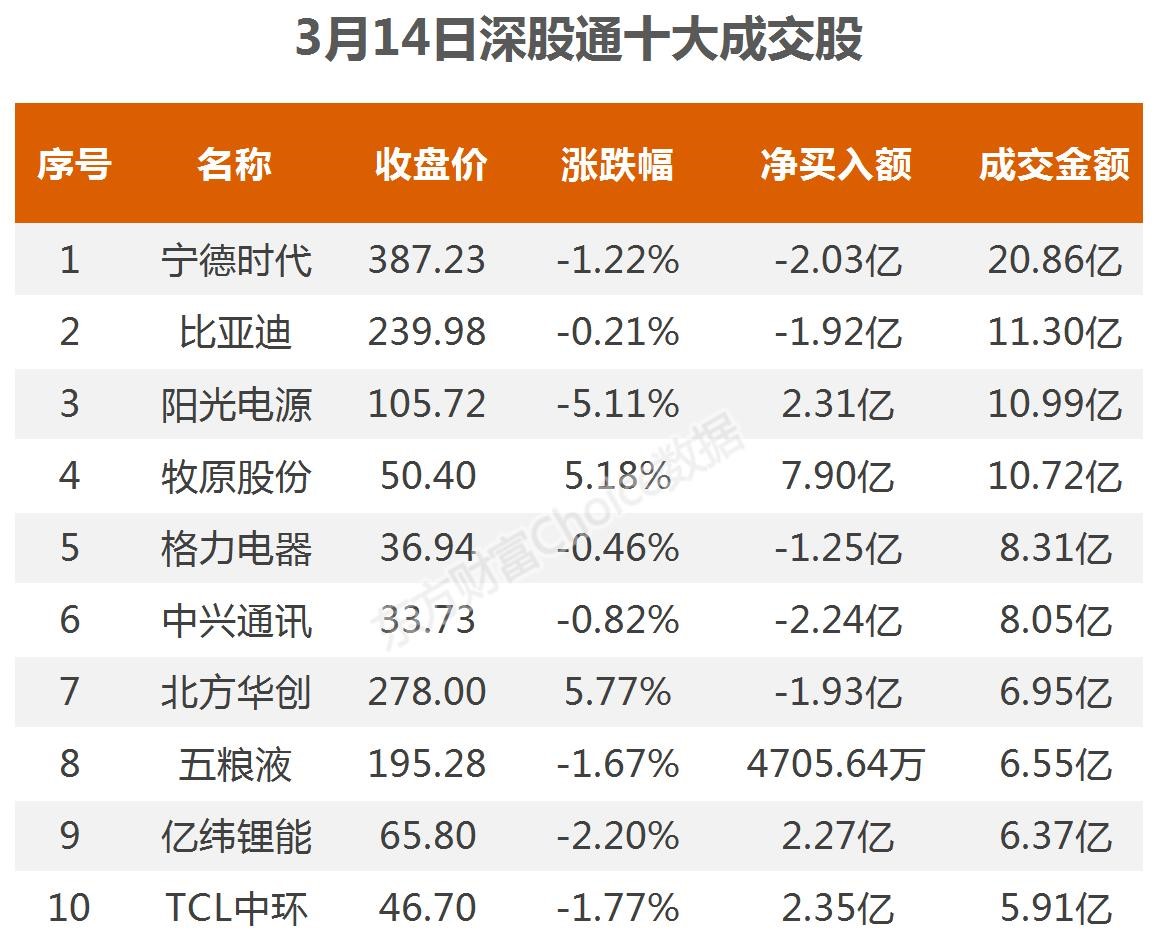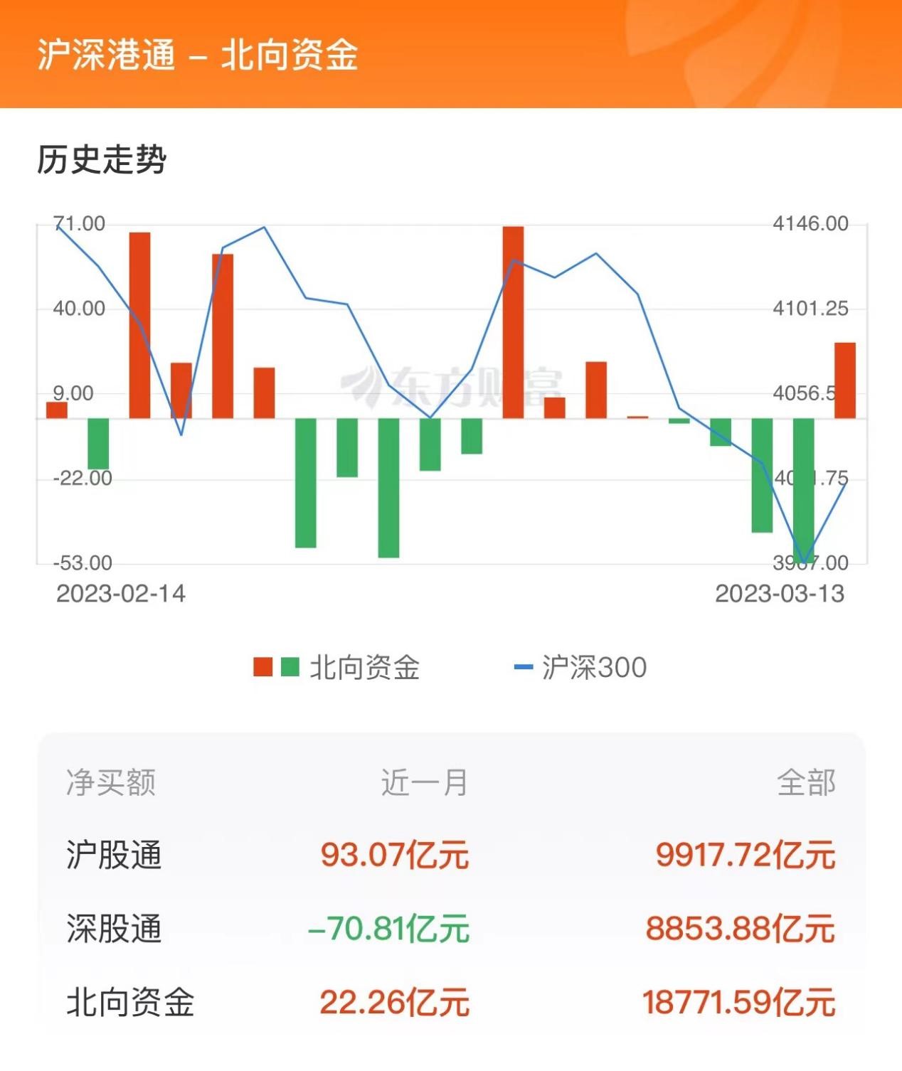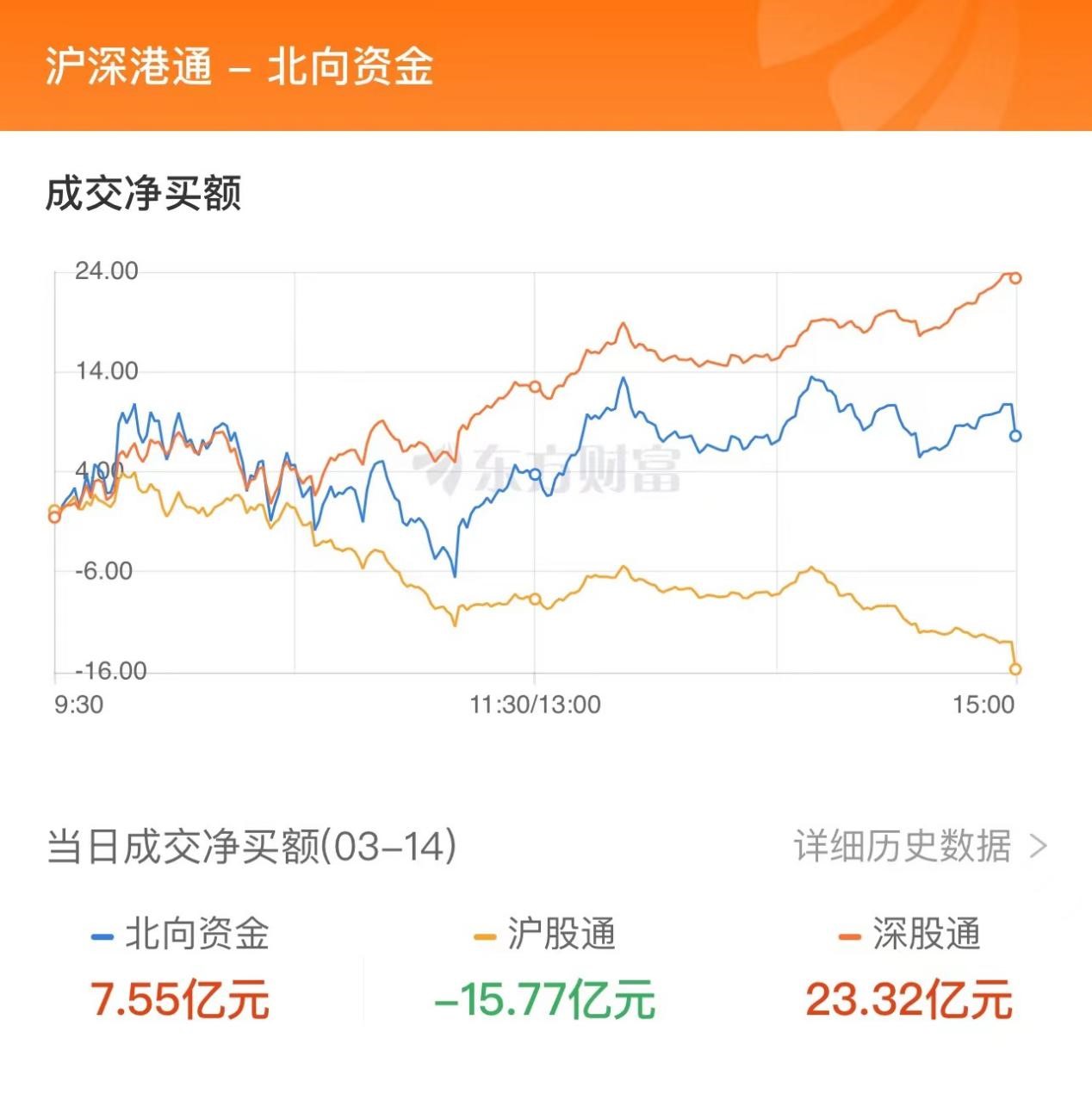 3月14日,大盘探底回升,三大指数均小幅下跌,个股跌多涨少。北向资金当日净买入7.55亿元,其中,沪股通当日成交净卖出15.77亿元,深股通当日成交净买入23.32亿元。北