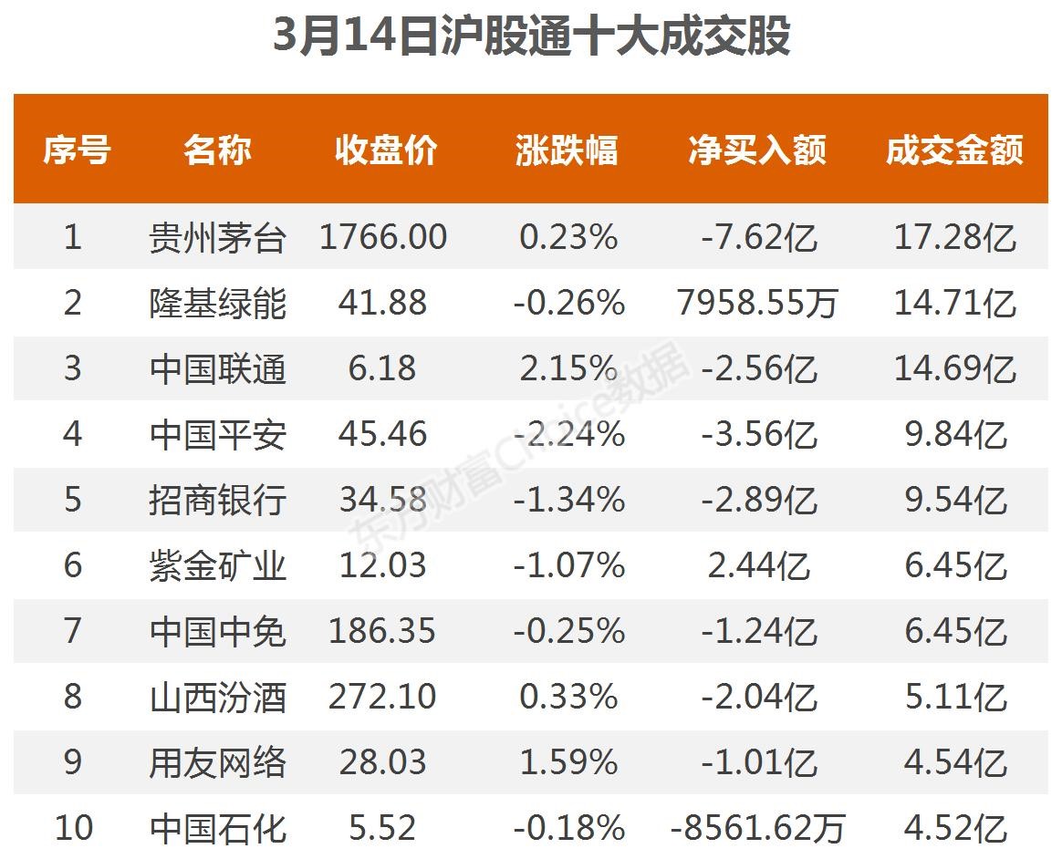 3月14日,大盘探底回升,三大指数均小幅下跌,个股跌多涨少。北向资金当日净买入7.55亿元,其中,沪股通当日成交净卖出15.77亿元,深股通当日成交净买入23.32亿元。北向资金成交金额1064.14亿元,占A股总成交额11.44%,交易活跃度上升16.95%。