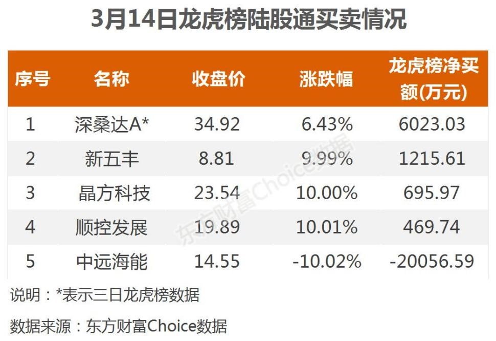 3月14日,陆股通参与龙虎榜中个股共涉及5股,其中4股被陆股通净买入。深桑达A被买入最多,三日净买入6023.03万元,新五丰也被净买入1215.61万元。此外,中远海能被陆股通净卖出,金额为2.01亿元。