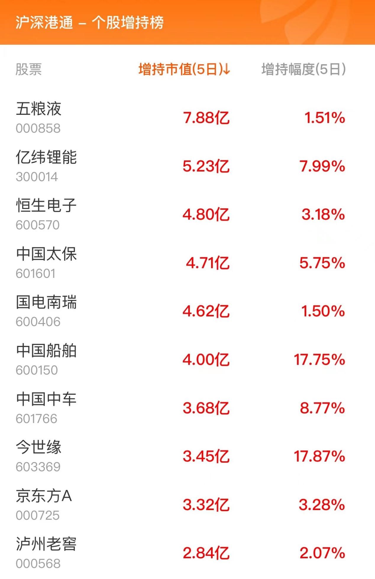数据显示,近五个交易日,北向资金增持五粮液7.88亿元,增持亿纬锂能5.23亿元,增持恒生电子4.80亿元。此外,浙江世宝近五日增持幅度最大,达428.74%。