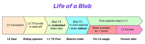 下图是从另一个角度对Blob生命周期的阐述,我们可以清晰地看到blob数据不会上L1主链,只会存在共识层节点之中,并且它有着不一样的生命周期。