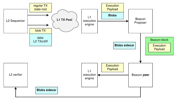 L1的节点(Beacon Proposer)看到了交易,它会在新的区块提议(Beacon Block)里面执行相关交易并进行广播;但在广播的时候,它会把Blob分离出来留在共识层CL中,并不会把它放到执行层的新区块里面