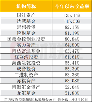 据朝阳永续定期数据显示,截止至3月10日,国内具有可比数据的3784家股票私募基金公司中,有3192家私募公司今年以来取得正收益,占比超过8成。今年以来收益率超过50%的有14家,国沣资产以135.14%的收益率占据冠军宝座,达慧基金紧随其后,其年内收益率也高达115.50%。思想投资、锐耐基金、国票金控创投年内收益率均超过80%。