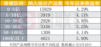 若细分到产品来看,百亿产品的表现也略显逊色。数据显示,规模为0-5亿元的私募产品今年以来收益率最高,为4.29%,而100亿以上的产品的年内收益率为3.90%,同样低于小规模产品。