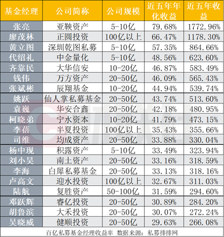 从基金经理的角度看,私募排排网数据显示,近5年年化收益最高的是亚鞅资产的张亮,为79.68%,其公司的规模为5-10亿元;百亿私募正圆投资的廖茂林位居第二,近五年年化为66.47%。而近五年年化收益前二十的基金经理中,仅有3位基金经理来自百亿私募基金,除了廖茂林外,其余两名是半夏投资的李蓓,迎水投资的卢高文。来自管理规模在5-50亿元私募的基金经理占据五年年化收益榜的大半江山。