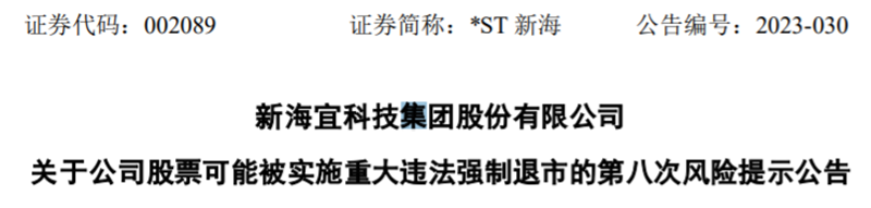 *ST新海表示,公司2016年至2019年连续4年财务指标,可能触及《深圳证券交易所上市公司重大违法强制退市实施办法》第四条第(三)项规定的重大违法强制退市情形。