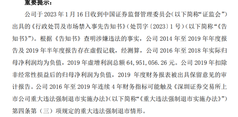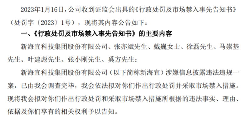 1月17日,*ST新海公告称,公司收到证监会下发的《行政处罚及市场禁入事先告知书》(下称“《告知书》”)显示,公司涉嫌违法的事实包括2014年至2019年年报及2019年半年报存在虚假记载。