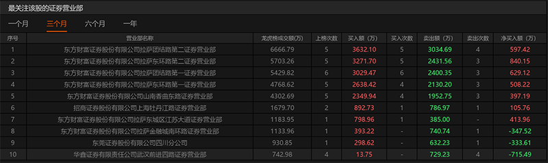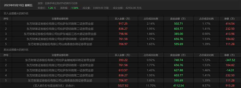 其中,前五大买方席位,分别是东财拉萨东环路第二证券营业部、东财拉萨团结路第二证券营业部、东财拉萨东城区江苏大道证券营业部、东财拉萨团结路第一证券营业部、东财山南香曲东路证券营业部。