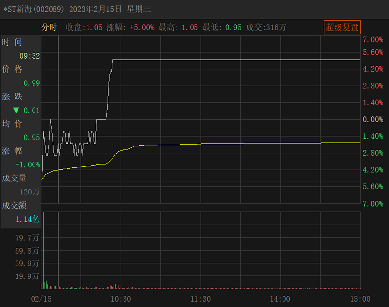 而在2月15日发布增持计划后,*ST新海股价低开高走,以0.95元开盘,不久后直奔涨停,升至1.05元直至收盘,其触及交易类强制退市相关条款的时间被延后。