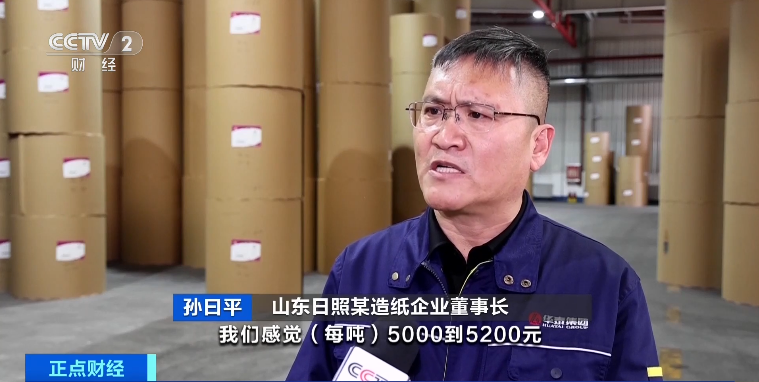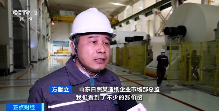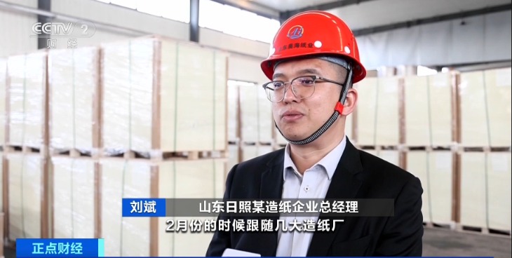 山东日照某造纸企业总经理刘斌:2月份的时候,跟随几大造纸厂已经发布了一轮涨价函。我们还会再涨100元到200元。