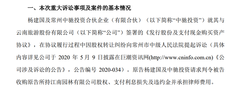 以杨建国、中驰投资提起的诉讼为例,2021年4月,法院已作出一审判决,判令云南旅游分别以1.24亿元、9172.67万元的价格收购两位原告所持江南园林股权,并支付违约金。云南旅游不服一审判决,向江苏省高级人民法院提起上诉,随后的二审仍然维持了原判。