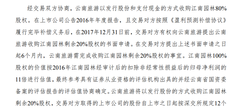云南彼时旅游还承诺,若完成对赌,江南园林原股东将有权要求云南旅游收购剩余20%股权,并且云南旅游在申请提出的6个月内必须完成相关收购事宜。具体的收购价则按照江南园林2016年经审计后的扣非归母净利润的11倍对江南园林100%股权进行估值。