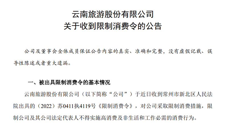云南旅游3月14日晚公告,公司收到常州市新北区法院出具的《限制消费令》,对公司采取限制消费措施,限制公司及法人不得实施高消费及非生活和工作必需的消费行为。此番被出具限制消费令的原因主要系江南园林原股东胡九如、卢鹰等9人与公司股权纠纷案向法院申请强制执行导致。