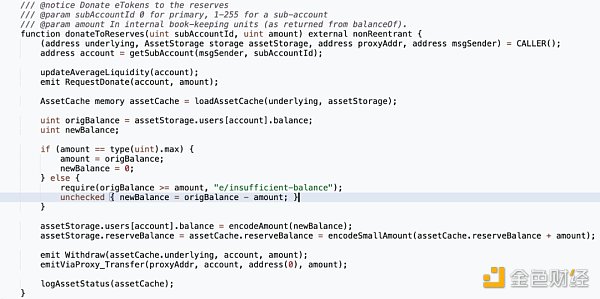 6. 然后调用 donateToReserves 函数将 100,000,000 枚 eDAI 捐赠给储备地址,此时账户中的 eDAI 剩下 310,930,612 枚,而债务代币 dDAI 有 390,000,000 枚,此刻账户处于爆仓状态,但 donateToReserves 函数并没有检查账户的健康系数。