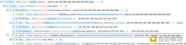 2. 其次将 20,000,000 枚 DAI 通过 deposit 函数存入 Euler 中,获得了 19,568,124.3 枚抵押物凭证代币 eDAI。