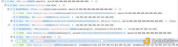 4. 紧接着调用 repay 函数用剩余的 10,000,000 枚 DAI 进行还款,其目的是为了减轻债务并增加抵押物价值,以便再次进行借贷。