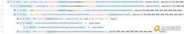 1. 攻击者首先从 Aave 中闪电贷出 30,000,000 枚 DAI,并创建了两个子攻击合约(0x583c21) 和(0xA0b3ee),为后续攻击做准备。