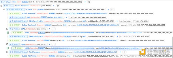 3. 之后调用 mint 函数(self borrow) 进行借款,借出了 195,681,243 枚 eDAI 和 200,000,000 枚债务代币 dDAI。