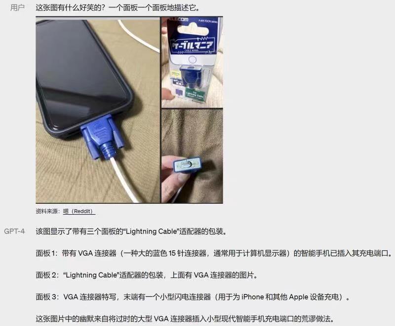 OpenAI用一张“梗图”演示了GPT-4特有的多模态功能。在以下输入图片并设问“这些图片有何可笑之处?请逐一描述。”GPT-4便会在对每张图片进行表述后表示,“这幅图的幽默之处在于,把一个大而过时的VGA接口插入一个小而现代的智能手机充电端口是荒谬的。”