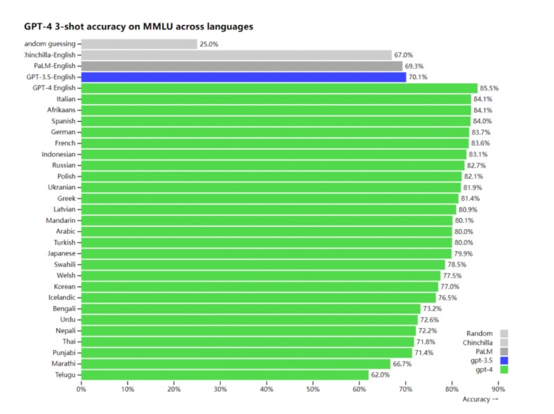除了普通图片,GPT-4还能处理更复杂的图像信息,包括表格、考试题目截图、论文截图、漫画等。此外,在多语种方面,GPT-4也体现出优越性。在测试的26种语言中,GPT-4在24种语言方面的表现均优于GPT-3.5等其他大语言模型的英语语言性能,其中包括部分低资源语言如拉脱维亚语、威尔士语等。在中文语境中,GPT-4能够达到80.1%的准确性。