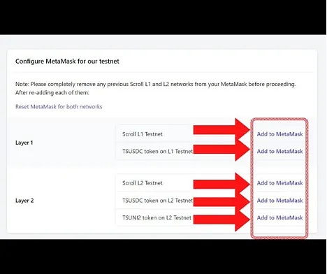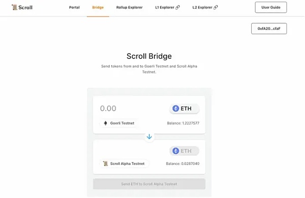 用户可以通过进入网站(网址:https://scroll.io/prealpha)进行简单的交互,包括添加MetaMask钱包,进行L1和L2测试网之间的转账,作为参与并测试网络的一种形式,以实现和Scroll的互动。