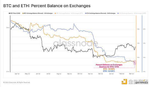 随着硅谷银行倒闭的消息传来,投资者纷纷转向 BTC 和 ETH 寻求避难所,我们监测的各个交易所都出现了显着的资金外流。大约 0.144% 的 BTC 和 0.325% 流通中的 ETH 从交易所储备中被提取,表明与 FTX 崩溃类似的自我托管反应。