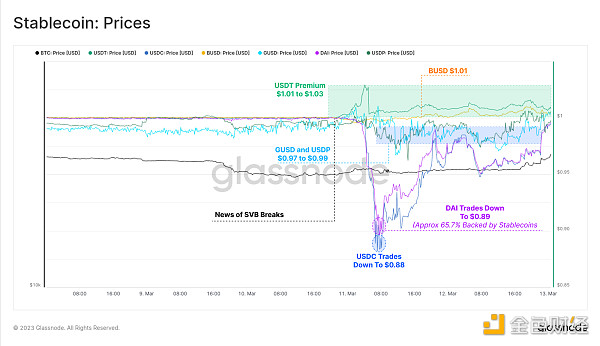 对于这三家银行机构,预计将通过持有的储备金,或通过 FDIC 和美国监管机构的存款担保,归还全部存款。由于许多大型数字资产公司和稳定币发行商使用这些银行合作伙伴中的一个或多个,导致周末的行情变得不稳定。特别值得关注的是 USDC 的发行商 Circle,他告知在 SVB 持有约 33 亿美元的现金,为 USDC 暂时打破 1 美元的挂钩创造了条件。