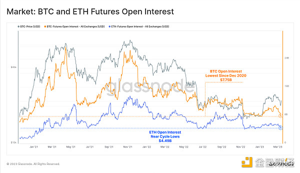 尽管交易量增加,但期货未平仓合约仍触及周期性低点。投机兴趣导致 BTC 爆炸性反弹至 22,000 美元,ETH 回升至 1600 美元。