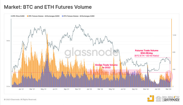 对于期货交易量,比特币的主导地位相似,约为 60%,并且在 FTX 后和年底沉寂之后,交易量已经回升。总交易量约为 582 亿美元/天,相当于 2022 年全年的水平。