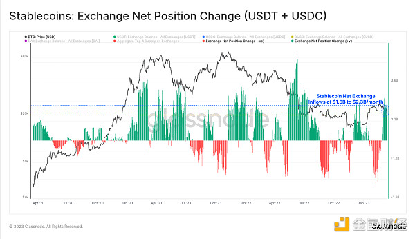 另一方面,两种主要的稳定币每月净流入交易所 18 亿至 23 亿美元。重要的是要注意,BUSD 以惊人的 每月 -68 亿美元的速度从交易所流出,这远远抵消了这一点。因此,很可能正在发生一定程度的“稳定币转换”。